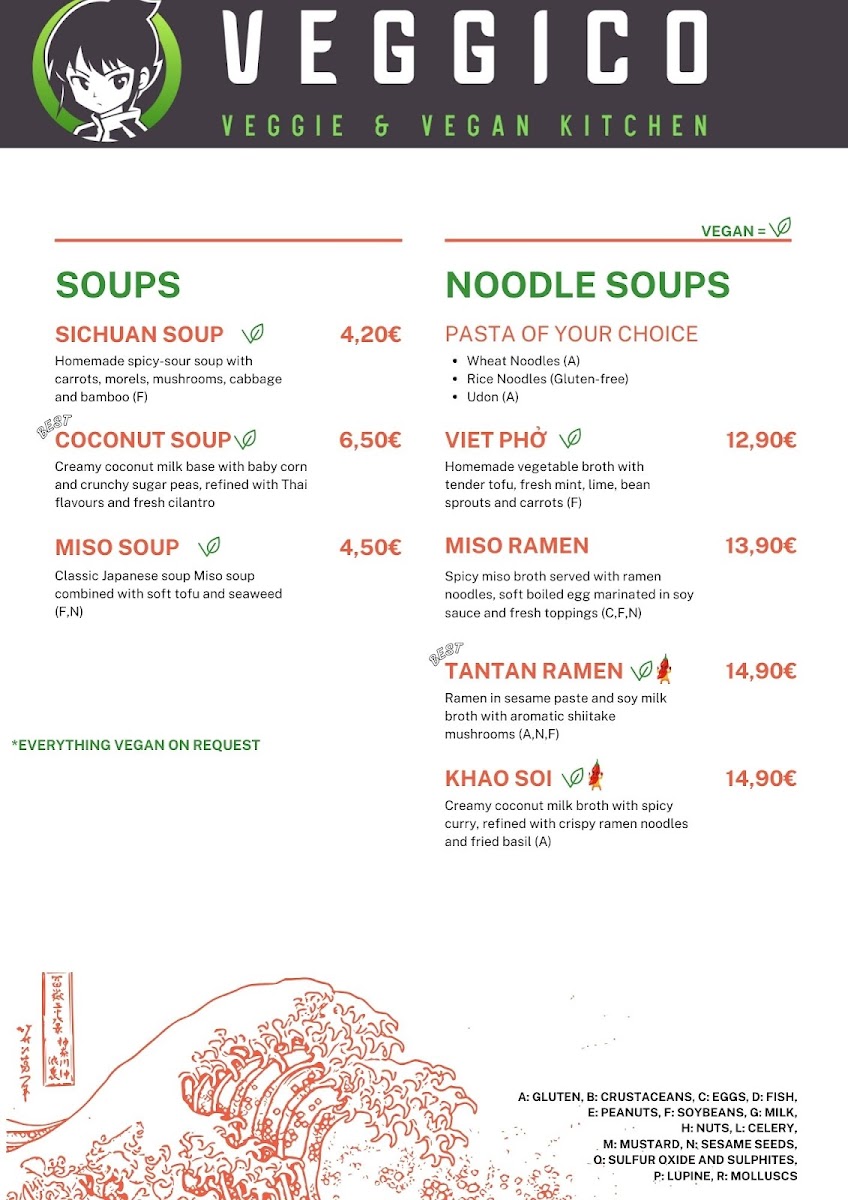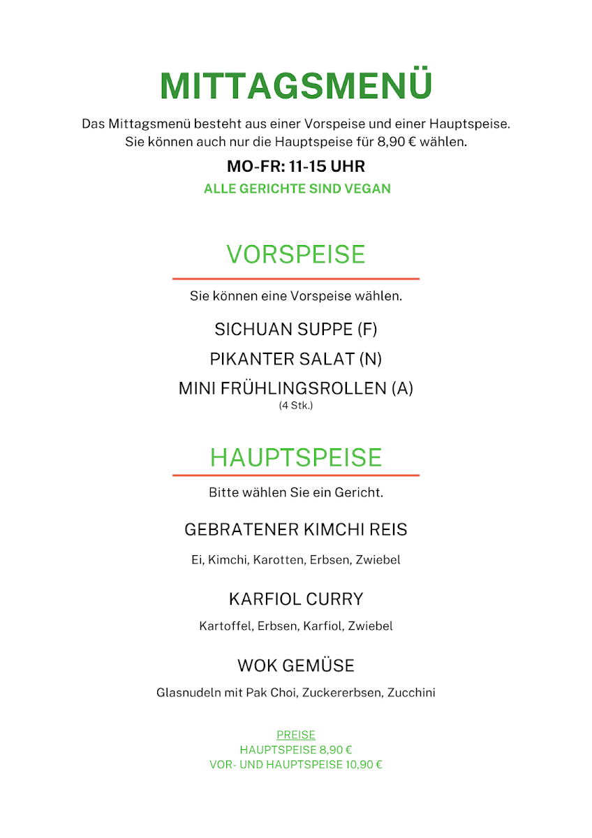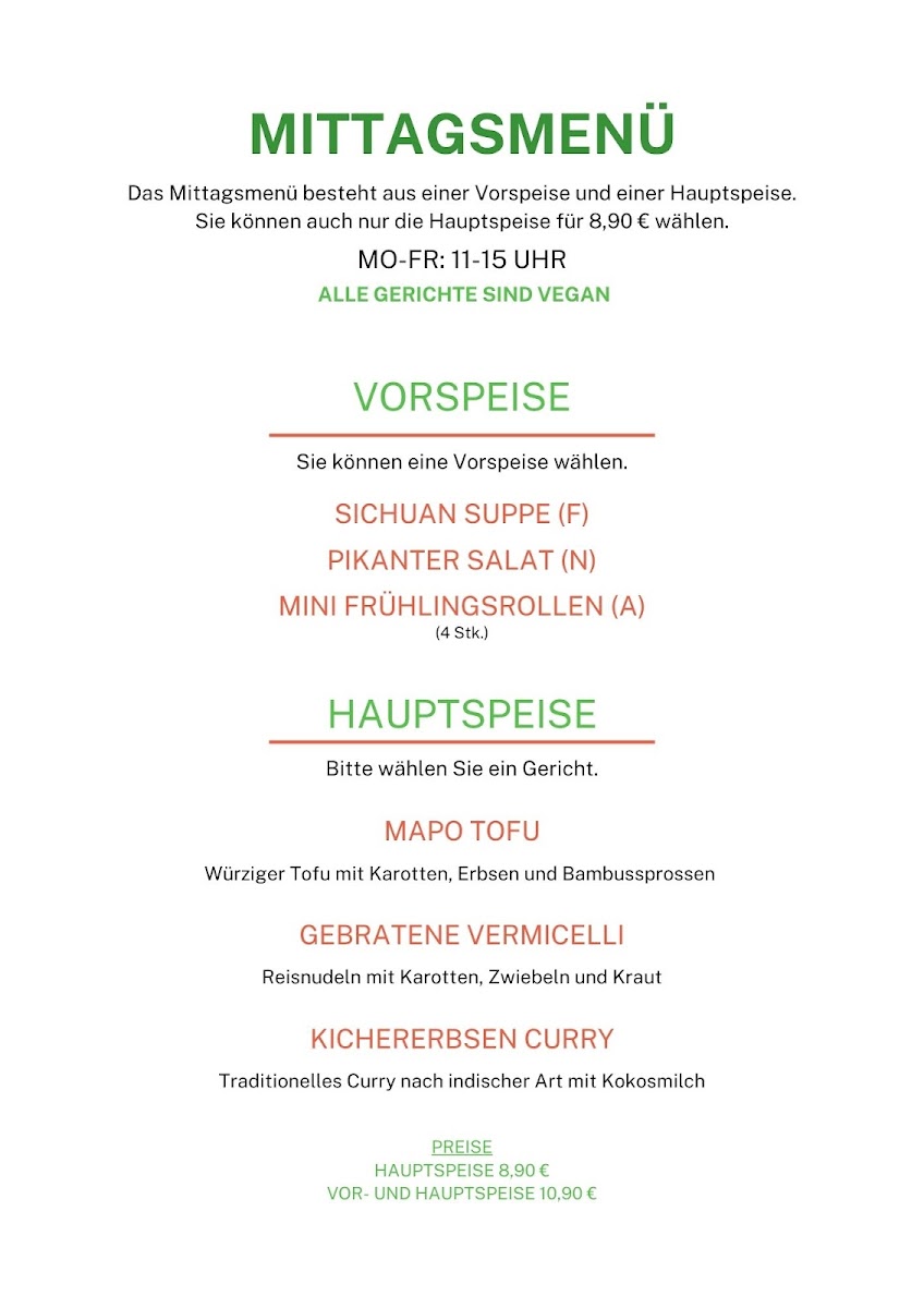 ................................€14.90hausgemachte Gemüsebrühe mit zartem Tofu, frischer Minze, Limette, Sojasprossen und Karotten.